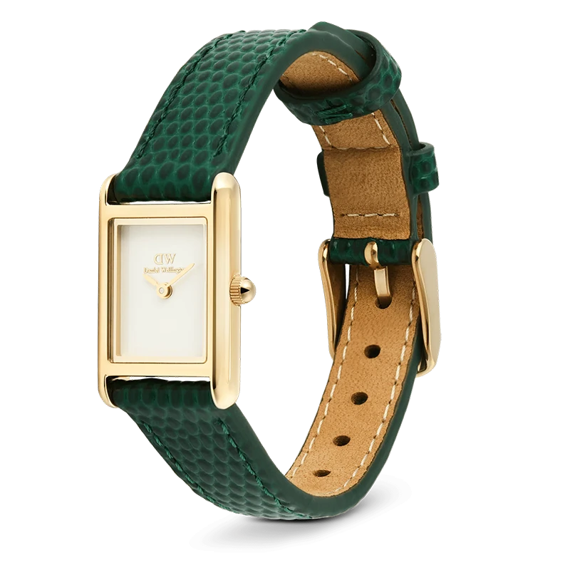 Den rektangulära designen ger ett tidlöst uttryck, samtidigt som det gröna bandet skapar en modern kontrast som lyfter både vardagskläder och mer uppklädda looks. Bandet är tillverkat av kromfritt äkta läder och präglat för att skapa en taktil, strukturerad yta. Det smalnar av för en bekväm passform och hålls på plats med ett polerat spänne. Ett japanskt kvartsurverk säkerställer pålitlig precision, vilket gör modellen till en trygg följeslagare genom hela dagen.