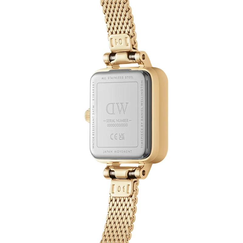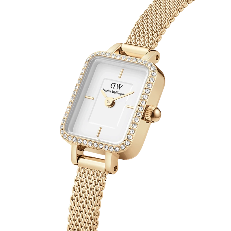 Den fyrkantiga boetten i guldfärgad PVD ger klockan ett modernt och sofistikerat uttryck, medan den dekorativa bezeln är prydd med noggrant infattade kristaller som fångar ljuset vid varje rörelse. Den vita urtavlan håller designen ren och klassisk, och det tunna mesh-armbandet i guld förstärker den smyckesliknande känslan. Med endast 6 mm tjocklek sitter klockan otroligt lätt och elegant på handleden.