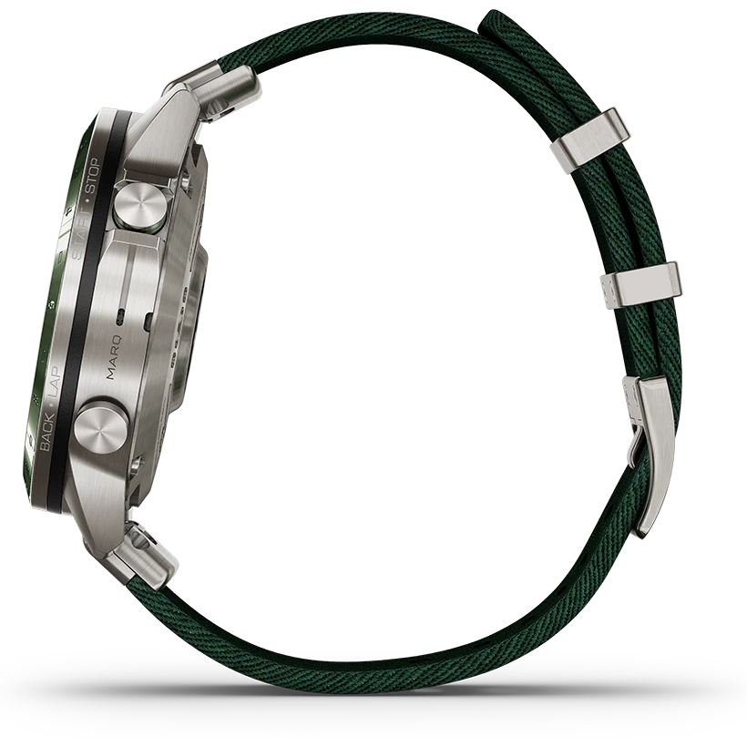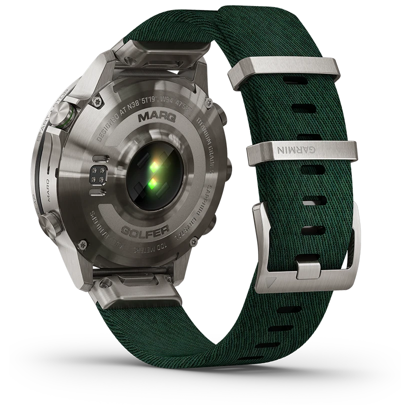 Den robusta boetten i fiberförstärkt polymer matchas med en sofistikerad grön tavelring som direkt för tankarna till golfens värld. Det gröna textilarmbandet är tåligt, bekvämt och skapat för att sitta stabilt under hela rundan. Under det kupade safirglaset sitter en briljant AMOLED-skärm som visar statistik, kartor och notifikationer med fantastisk tydlighet. Med en vikt på endast 87 gram är den lätt att bära även under långa och intensiva spelpass.