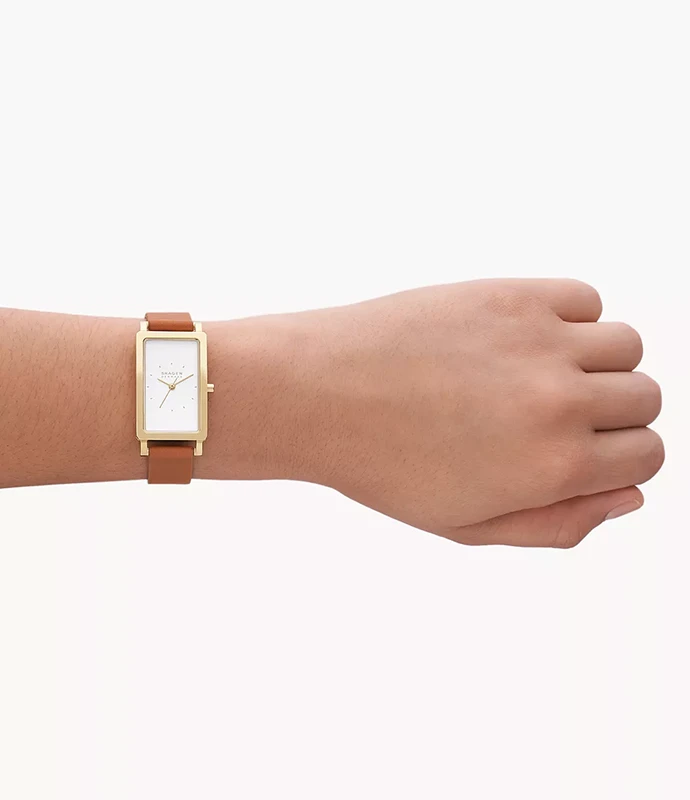 Den här Hagen Lille har en tank-boett på 43 × 22 mm och en vit urtavla med sandblästrad finish. Klockan drivs av ett trevisarurverk och levereras med ett luggage-färgat läderarmband. Armbandet är utbytbart för enkel stilvariation.