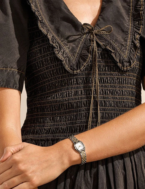 Denna lilla klocka kännetecknas av en tvåfärgad kuddboett och en matchande sunray-urtavla. Modellen kompletteras av ett tvåfärgat armband i rostfritt stål med tvåknapps fold-over-spänne, vilket skapar en stilren och modern finish.