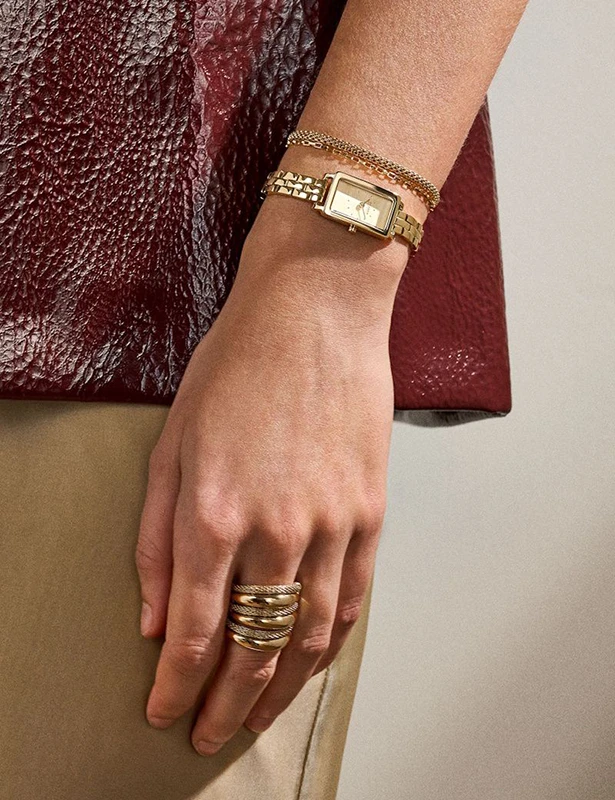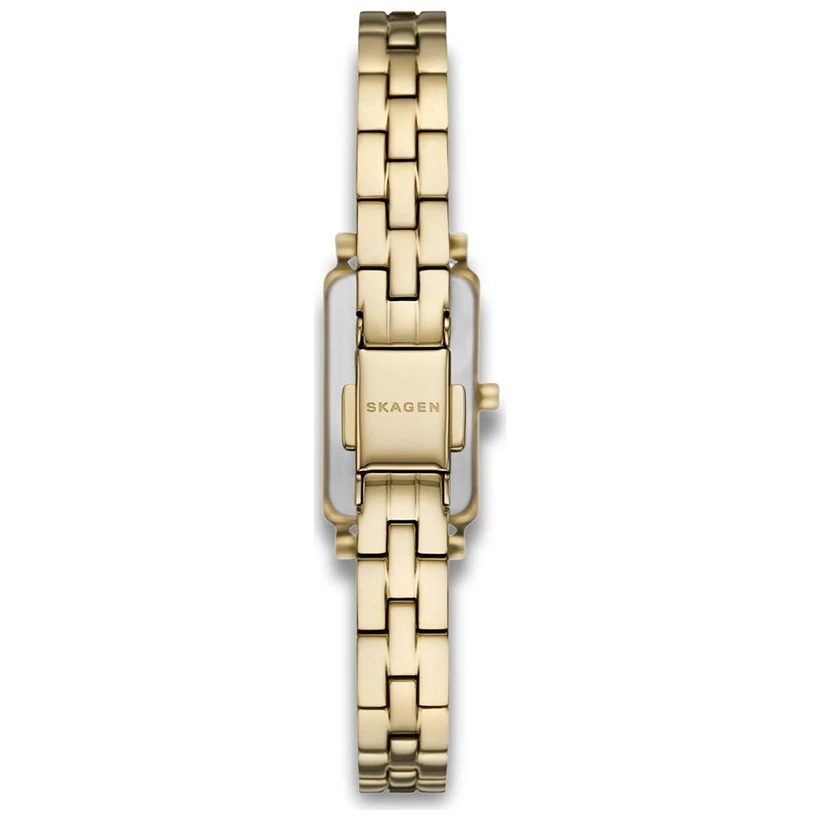 Den här 31 mm Hagen Micro har en urtavla i guldsandblästrad finish och ett tvåvisarurverk. Klockan levereras med ett guldfärgat armband i rostfritt stål, och armbandet är inte utbytbart.