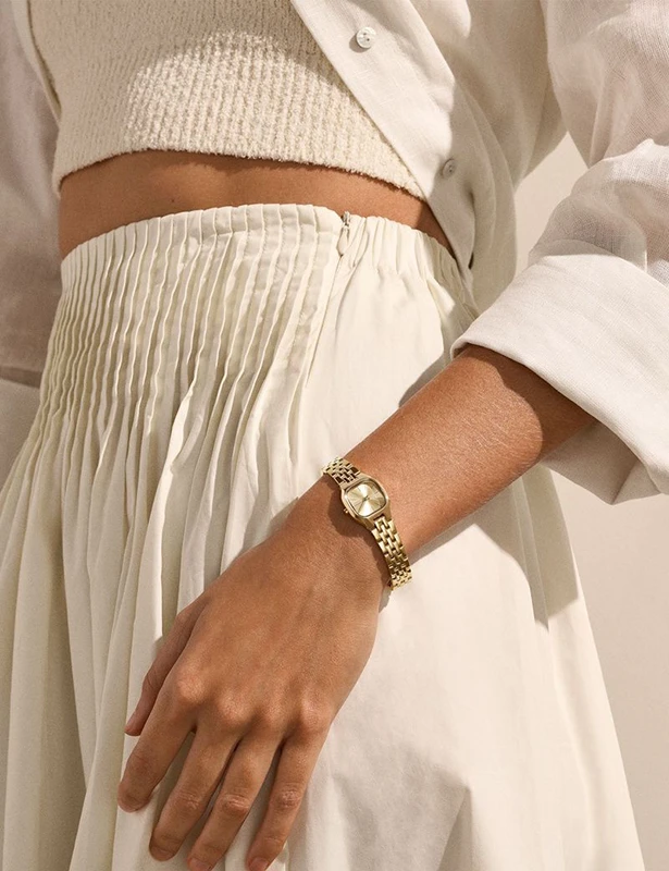 Denna lilla klocka kännetecknas av en guldfärgad kuddboett och en matchande sunray-urtavla. Modellen kompletteras av ett guldfärgat armband i rostfritt stål med tvåknapps fold-over-spänne, vilket skapar ett elegant och sofistikerat uttryck.