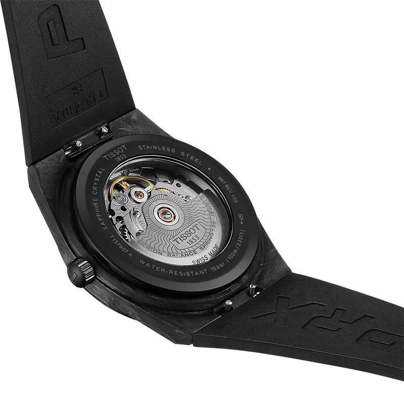 Boetten i forged carbon gör varje klocka helt unik, med ett levande mönster i svart och grått samtidigt som vikten hålls extremt låg. Den ikoniska PRX‑formen i kombination med det matta, tekniska materialet ger ett modernt och kompromisslöst uttryck. Den svarta urtavlan i carbon smälter samman med boetten och förstärker helhetsintrycket, medan tydliga index och visare ger god läsbarhet. Det svarta syntetiska bandet är specifikt utvecklat för denna modell och bidrar till både komfort och sportig estetik.