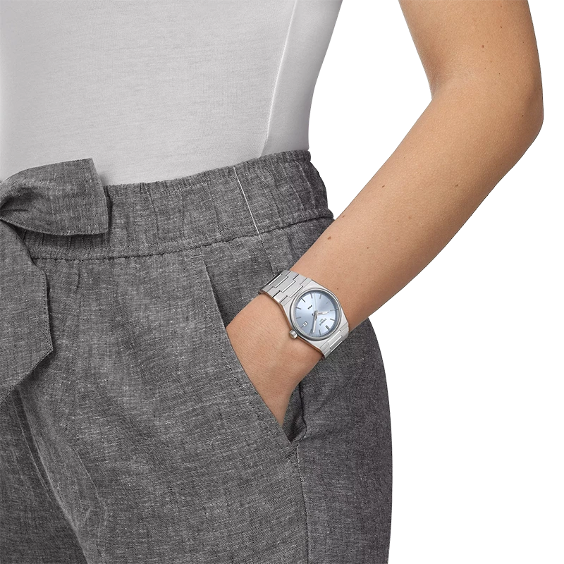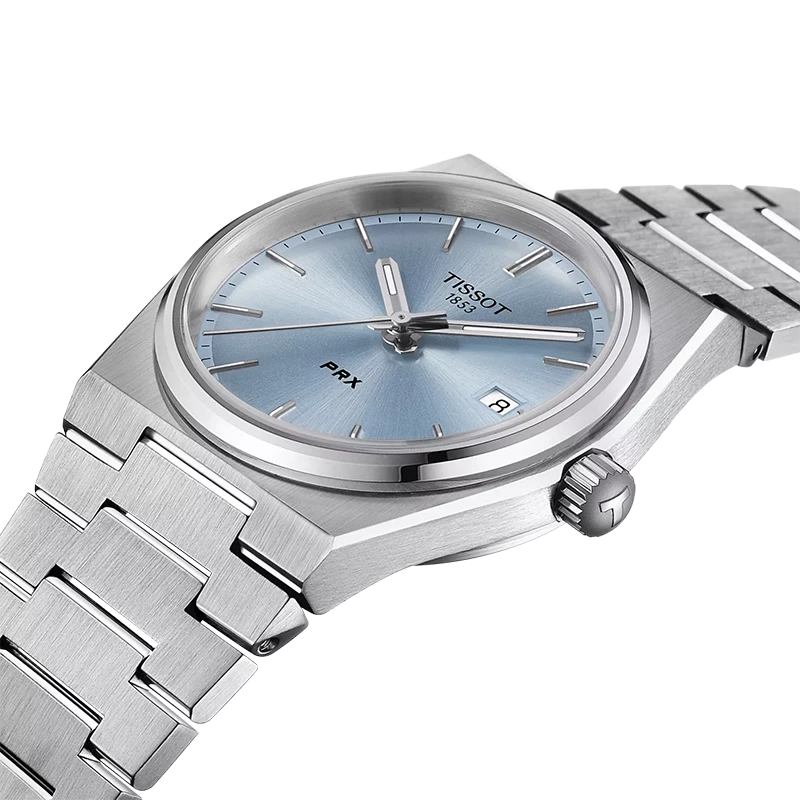 Den slimmade tonneauformade boetten och det integrerade stålarmbandet ger PRX dess omisskännliga retrokaraktär. Den ljusblå urtavlan tillför ett friskt och samtida uttryck som fångar ljuset elegant, samtidigt som de rena indexen och tydliga visarna säkerställer god läsbarhet. Med sin kompakta storlek på 35 mm identisk med originalmodellen från 1978 sitter klockan perfekt på handleden och passar både dig som föredrar ett nätt format och dig som söker en genuin vintagekänsla med modern finish.